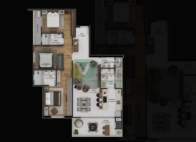 O empreendimento oferece apartamentos de alto padrão com 1 suíte + 2 dormitórios, ótima sacada com churrasqueira a carvão e 2 vagas de garagem com box privativo. Área privativa de 114,32 m².