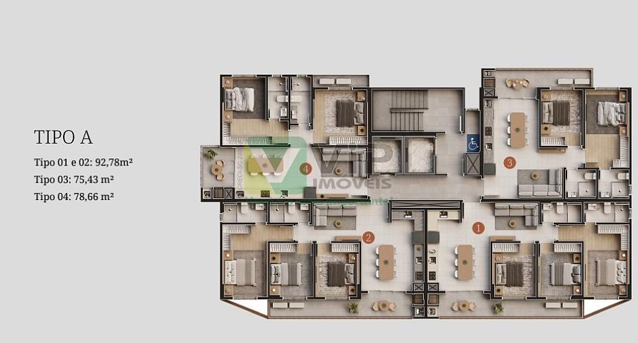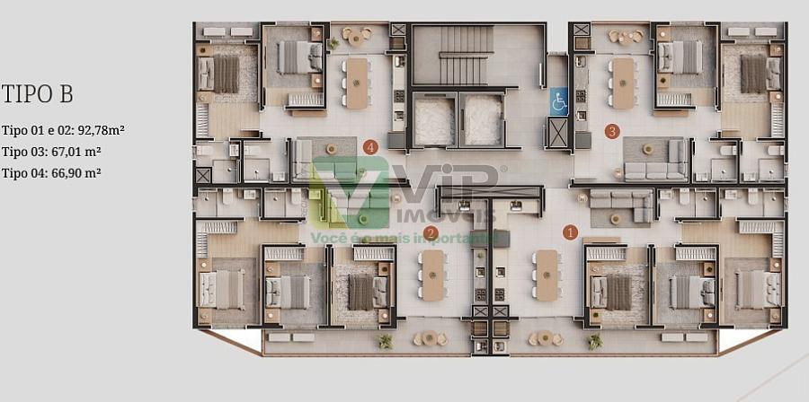 - Apartamento tipo B 01 e 02 com 92,78 m² - 1 suíte + 2 dormitórios.