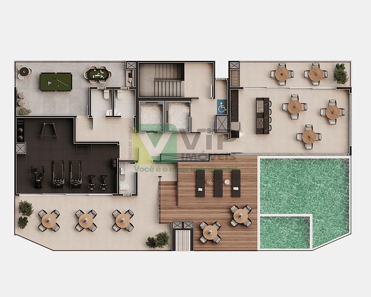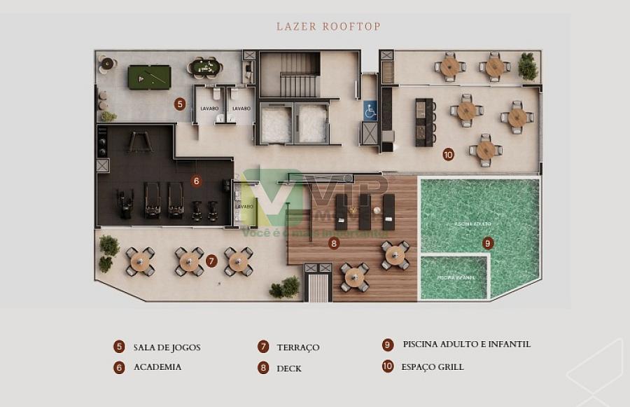 - Salão de festas, salão gourmet, playground, academia, sala de jogos, piscina adulto e infantil no Rooftop, espaço Grill, longe externo.